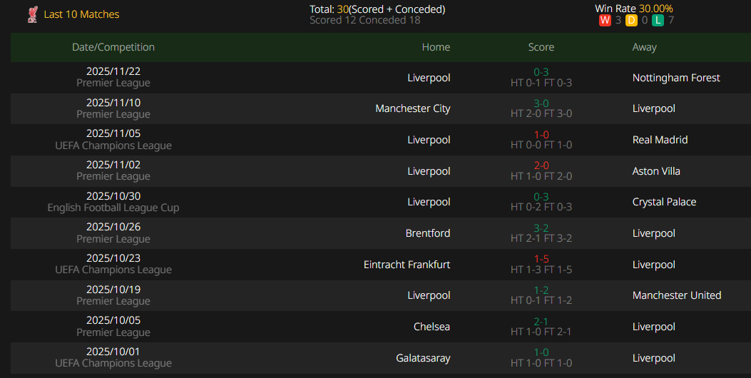 Liverpool host PSV Eindhoven at Anfield. The Reds have been in poor form recently, suffering a 0-3 home defeat to Nottingham Forest in the Premier League, marking a two-game losing streak. They have lost 6 out of their last 7 league matches, dropping to outside the top 10 in the standings. Injury-wise, Liverpool are facing significant issues, particularly at right-back. Connor Bradley and Jeremy Frimpong are both sidelined due to injuries. Attacking midfielder Florian Wirtz is likely to miss out again with a muscle injury. Tactically, Liverpool’s biggest problem lies in defense, especially their woeful set-piece defense—they have conceded 9 set-piece goals this season, compared to none at the same stage last year.