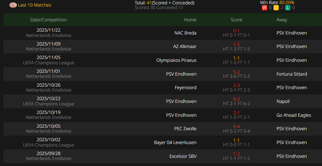 PSV Eindhoven, on the other hand, are in excellent form, remaining unbeaten in their last 10 games across all competitions (8 wins, 2 draws). They secured a narrow 1-0 victory over Breda in their last league match, maintaining their position at the top of the Eredivisie. In terms of squad fitness, PSV are much more intact, with only Mark van Bommel and Alassane Plea unavailable. As an attacking-oriented team, PSV are likely to pose considerable pressure on Liverpool’s fragile defense.