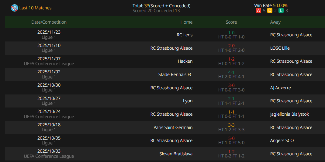 In terms of recent form, Strasbourg have shown "home specialist" traits this season. They have an impressive 5 wins and 1 loss in 6 league home games, while topping the group with an unbeaten 2 wins and 1 draw in the Europa Conference League, demonstrating a strong desire to win in cup competitions. However, the team's form has been inconsistent lately, losing 0-1 to Lens in their last league game, and they are facing injury problems – key midfielder Habib Diarra has been sidelined long-term, leading to a decline in midfield organization and orchestration ability. The suspension of defender Jean-Eudes Aholou has compounded the problems of an already leaky defense.