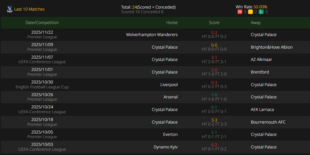 Crystal Palace, meanwhile, are one of the surprises in European football this season. They are firmly ranked 5th in the Premier League, just 1 point away from the Champions League places, and sit closely behind in the Europa Conference League with 2 wins and 1 loss, accumulating 6 points. Under manager Oliver Glasner, the team has formed a highly resilient 3-4-2-1 formation, with particularly outstanding away performances – 3 wins, 1 draw and 1 loss in their last 5 away games, conceding only 0.86 goals per game, with defensive solidity unparalleled in the Premier League. Their attack relies on efficient counterattacks with a 75% counterattack success rate. Jean-Philippe Mateta's hold-up play and Jordan Ayew's speed and penetration form the core threat, creating 21 clear-cut chances per game on average, demonstrating strong finishing ability.