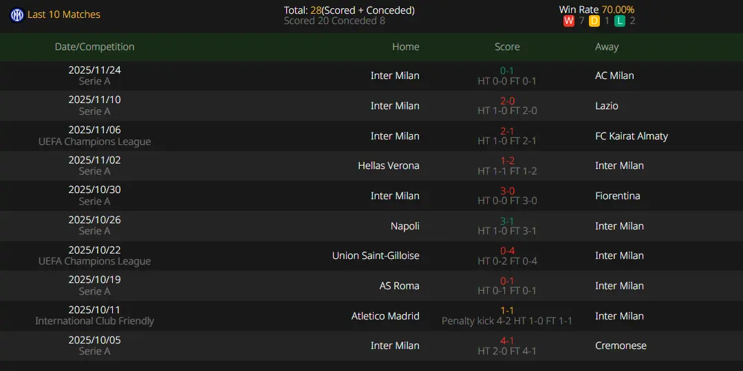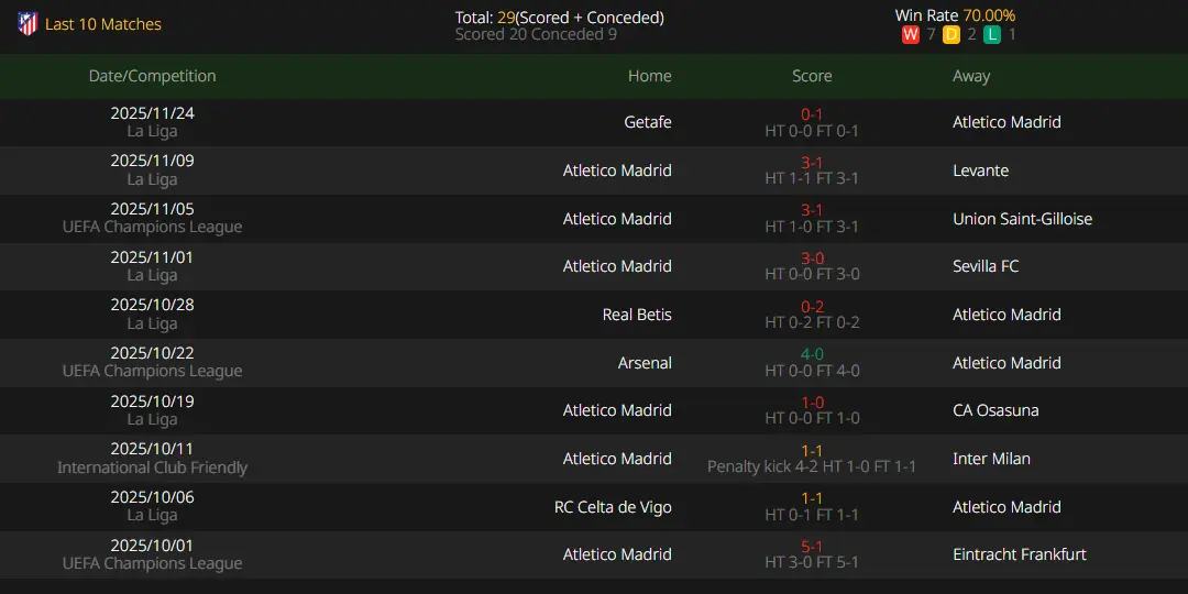 Inter Milan has displayed dominant form in the Champions League, winning all 4 of their first group stage games to accumulate 12 points (likely advancing to the round of 16), scoring 11 goals and conceding only 1. However, Inter suffered a 0-1 defeat in the Milan Derby last weekend, ending their four-match winning streak. This loss may affect team morale, especially against a strong opponent like Atlético. Inter adopts a 3-5-2 formation, focusing on possession and midfield control with an average possession rate of 59%. The team has a good counterattack conversion rate and creates chances through overlapping wing-backs. Lautaro Martínez is Inter’s top scorer, netting 8 goals and providing 2 assists this season, forming a threatening attacking partnership with Marcus Thuram. However, Inter’s three-center-back system has a noticeable flaw of slow turnovers, and they tend to start sluggishly away from home.