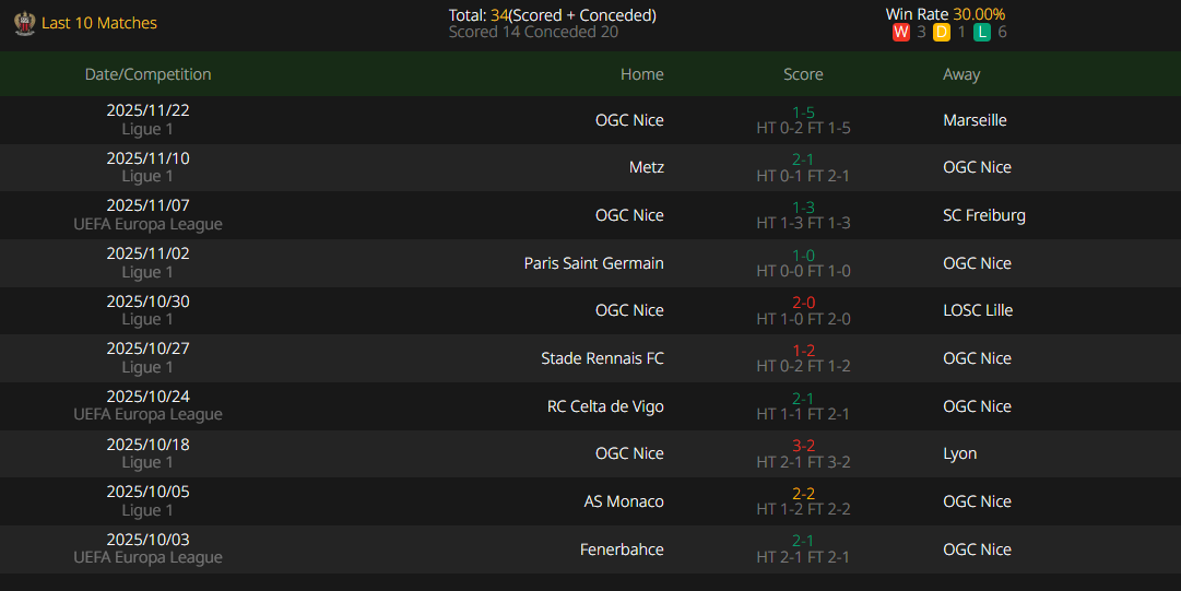 In contrast, Nice’s fundamentals are almost the polar opposite. In Ligue 1, Nice has only 5 wins from 13 rounds, ranking 9th—typical of a mid-table to lower-mid-table performance. Their home-away disparity is stark: they can barely rely on home atmosphere and occasional attacking brilliance to secure 4 wins from 7 home games, but have managed only 1 win from 6 away games, scoring 7 goals and conceding 13 (over 2 goals per game), with an away defense that collapses in nearly every match. Their Europa League campaign has been even more disastrous: 4 consecutive losses in the group stage, scoring 4 goals and conceding 9, accumulating 0 points to rank 35th overall—one of the worst-performing teams in the competition. The team has essentially given up on European competition.