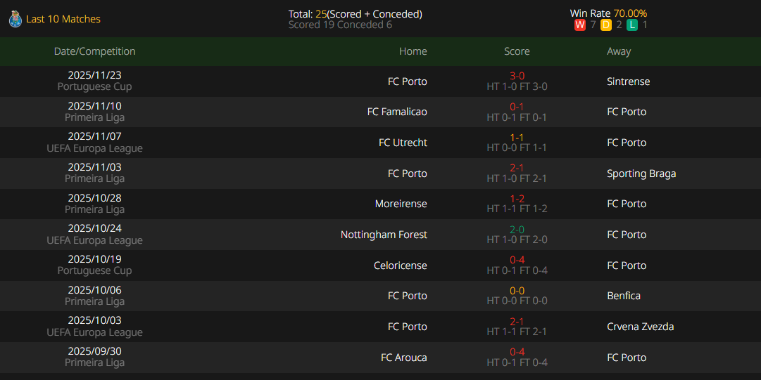 Porto remains unbeaten in the Primeira Liga with 10 wins and 1 draw, scoring 24 goals and conceding only 3, topping the standings with top-tier offensive and defensive efficiency. Their home form is particularly stable: they have collected 13 points from 5 league home games, conceding just 1 goal. In the UEFA Europa League group stage (Swiss Group Stage), Porto has achieved 2 wins, 1 draw, and 1 loss in the first 4 rounds, scoring 4 goals and conceding 4, accumulating 7 points to rank 14th overall—firmly in the middle of the qualification zone. Under the Swiss Group Stage points system, a home win in this round will put Porto in a strong position to close in on 8th place. With direct qualification to the knockout stage as their target, the home team has clear motivation and must secure 3 points.
