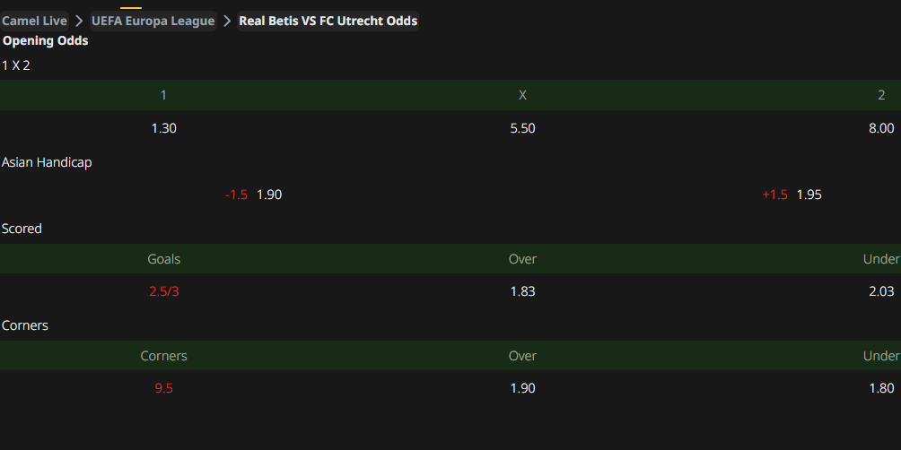 Real Betis and Utrecht have no prior record of facing each other in official football competitions. Despite the lack of direct head-to-head history, this Europa League clash marks their first official meeting. While Real Betis holds an advantage in overall strength, both teams rank 5th in their respective leagues (mid-table to upper-mid-table) with stable results. With no practical understanding of each other’s tactical details and key player characteristics, the opening phase of the match will involve significant probing, likely leading to a conservative style. The Asian Handicap opened with Real Betis as -1.5 favorites, reflecting their high popularity and strong market support. However, their actual performance does not justify complete dominance over Utrecht. Therefore, this match favors Utrecht to cover the +1.5 handicap away from home, avoiding a defeat by two or more goals.