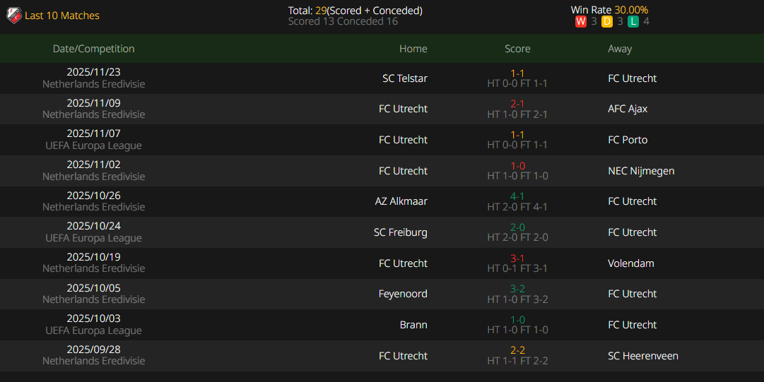 Utrecht’s performance in the league and European competition is vastly different. In the Eredivisie, they currently rank 5th—having defeated Ajax but also suffered heavy defeats to teams like AZ Alkmaar, showing inconsistent form. They drew with Telstar in the Eredivisie last weekend, with an overall win rate of only 30% recently. In European competition, they are trapped in a quagmire: 1 draw and 3 losses from 4 rounds, accumulating 1 point and teetering on the edge of elimination. Their attack is extremely inefficient, scoring only 1 goal in the Europa League. Utrecht has obvious away weaknesses: only 5 wins from their last 20 away games, losing both Europa League away games this season without scoring, and recording 1 draw and 5 losses in their last 6 away games—often conceding in the first half. Defensive issues are also prominent: their expected goals against (xGA) in the Europa League is as high as 20.3, with 17 actual goals conceded. Their recent away defense has been abysmal, conceding 6 goals in 3 away games (2 per game), with the obvious flaw of slow-turning center-backs.